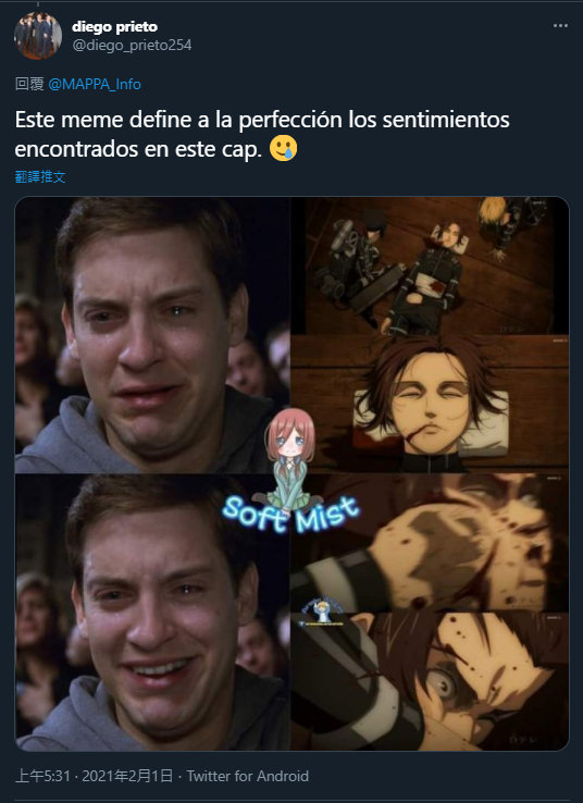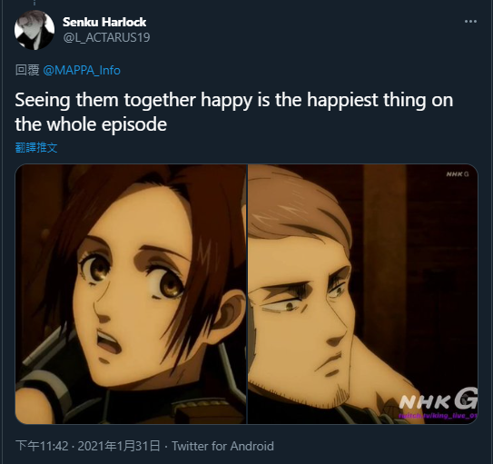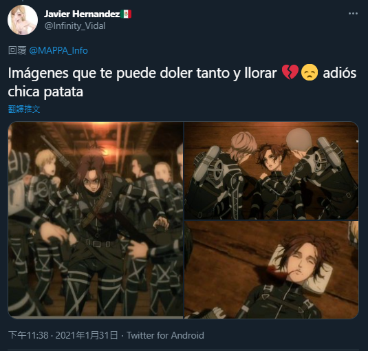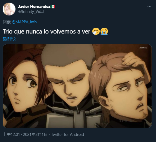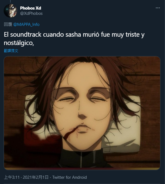 或許出自於紀念,在《進擊的巨人》開播後當日,MAPPA官方推特也釋出了莎夏的動畫原畫,而底下留言更是滿滿地哀悼。事實上過去也曾有粉絲表示,莎夏這個角色的魅力,與其說不輸給身為女主角的米卡莎,更可以說是更勝一籌,也因此在如此高人氣的角色就這樣突然離世,這一瞬間其實相當多人都還是難以接受的事實…
