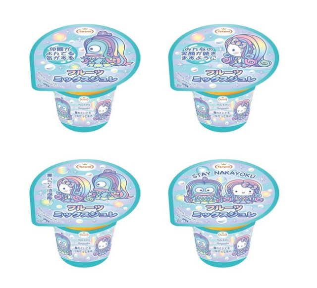 再來是由「Hello Kitty」與「人魚漢頓」兩個一同扮起阿瑪比埃出現的「綜合果凍」 ,以多種水果製作。外包裝分成四種款式,上面撕開的紙蓋有著插圖外,更有鼓勵人心的標語,提醒在疫情壟罩的各位打起精神,對人生保持正向的思考。( 本款商品於 2 月 23 日上市 )