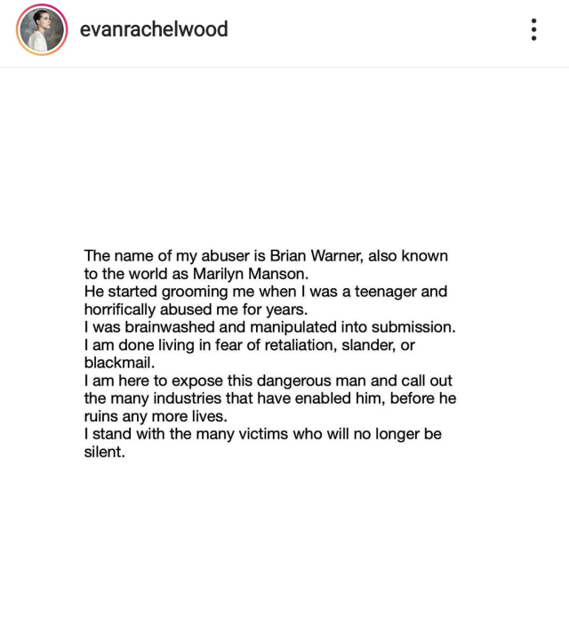 在周一清晨時伍德在個人的Instagram發文以及在雜誌《浮華世界》的聲明中說:「對我施暴的施暴者名叫布萊恩·華納(Brian Warner),也就是舉世聞名的瑪麗蓮·曼森(Marilyn Manson)。他在我十幾歲的時候就開始誘姦我、虐待我。我被洗腦也被操縱,以方便臣服於他。我已經害怕過著被報復、被誹謗和被勒索的生活。我說出來是為了揭露這個危險的人,並在他殘害更多無辜女性之前,我會勇敢的和其他受害者站出來並不再掩飾這段過去。 」