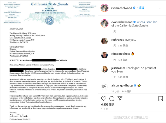 星期一晚上,伍德在Instagram上放上加州參議員蘇珊·盧比歐(Susan Rubio)寫給她的一封信,說會請美國聯邦調查局(FBI)開始調查曼森所犯下的施暴案件。
