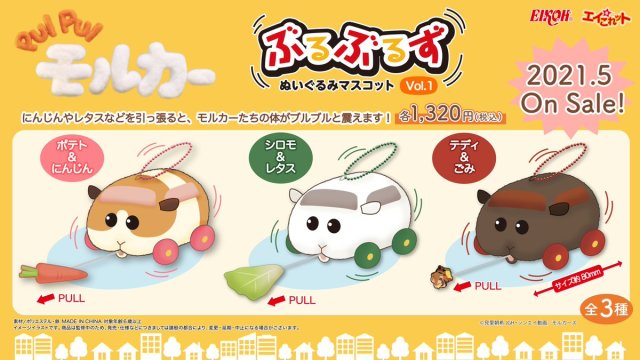 據官方所表示,這次所推出的《天竺鼠車車》立體娃娃一共分為兩種,第一種是一般的掌上型絨毛玩偶「ぬいぐるみマスコット」,款式共為五種,包含「馬鈴薯」、「西羅摩」、「巧克力」,以及「警車」跟「救護車」,實體總長大約為8公分,並且五隻還可以疊在一起。