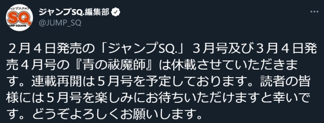 月刊雜誌《Jump Square》的官方推特也於同日表示「2 月 4 日發售的《Jump Square》3月號以及 3 月 4 日發售的4月號這兩期雜誌上的《青之驅魔師》都將會休刊,而將會在5月號上重新再開連載預定。希望各位讀者們可以一起期待一下5月號的到來,請各位多多指教。」