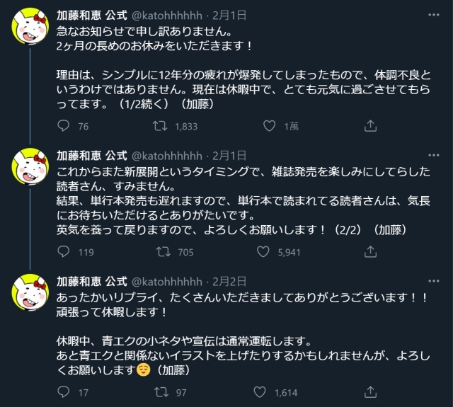 原作者加藤和惠又在個人推特上補充:「在今後又會有新展開的這個時機休息,對於期待雜誌發售的讀者們真的非常抱歉。而因為休刊兩個月,所以單行本的發售也會推遲,所以單行本派的各位讀者們如果能耐心等待的話那就太感謝了。我會在這段期間養精蓄銳,並且滿血回歸的,請多多關照。」
