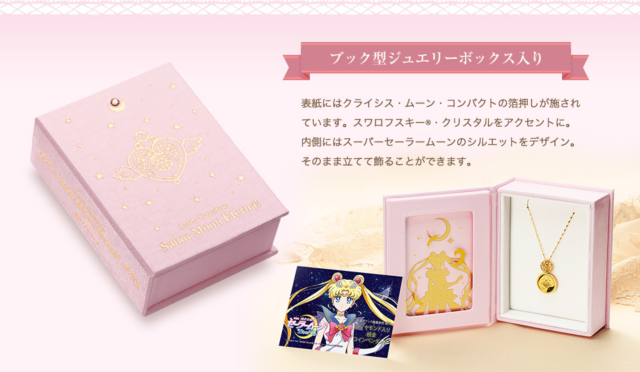 專屬的書本盒裝上面也鑲有施華洛世奇鑽石,打開後除了可以放置項鍊本體外,內裡也有著主角月野兔的剪影,不論是收納或是用來展示都非常匹配。