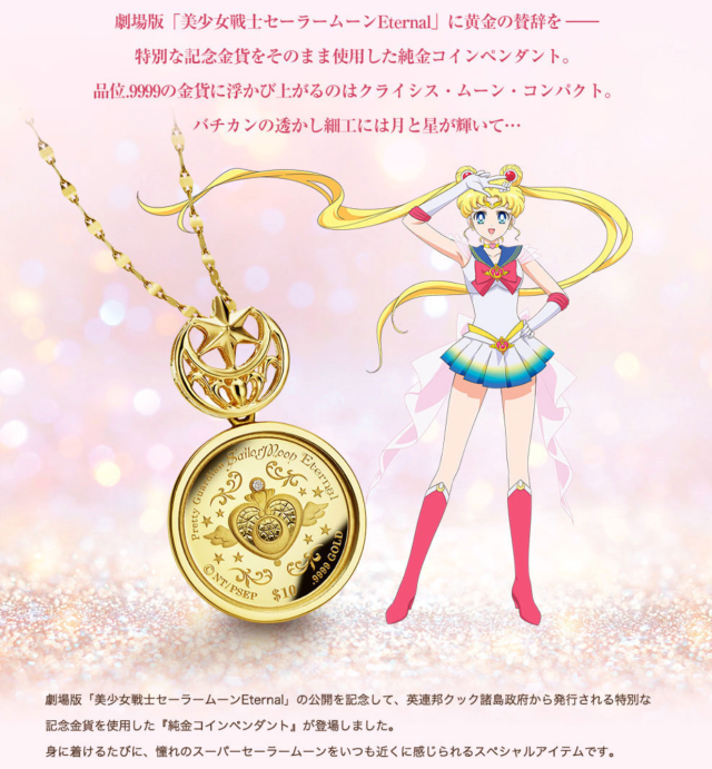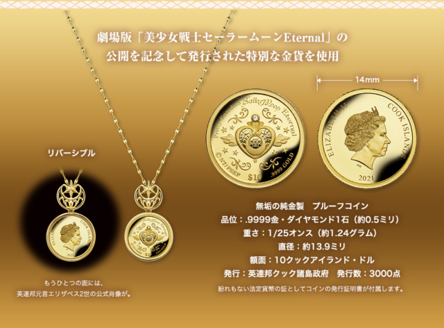 《劇場版美少女戰士 Eternal》目前前篇已於日本 2021 年 1 月 8 日上映,後篇則是 2 月 11 日。為了紀念全新劇場版的上映,推出紀念商品「純金硬幣項鍊」,以本次劇場版的視覺設計,限量 3,000 組。目前已可於日本 PREMICO 線上商城開放預購,目前定價為 99,800 日圓 ( 未稅 ),預計在 2021 年 3 月下旬陸續出貨。