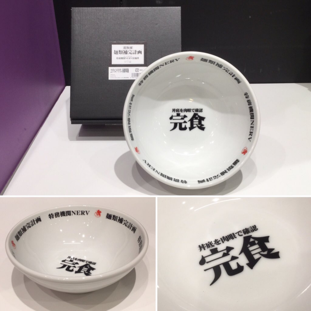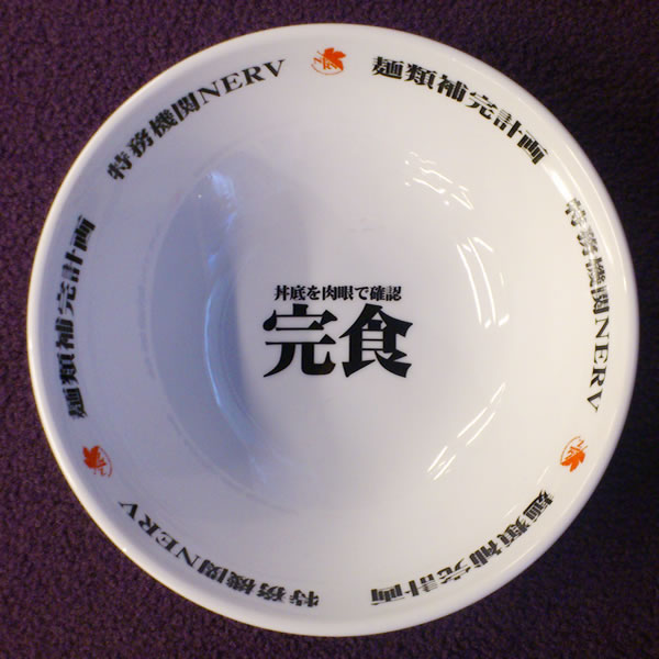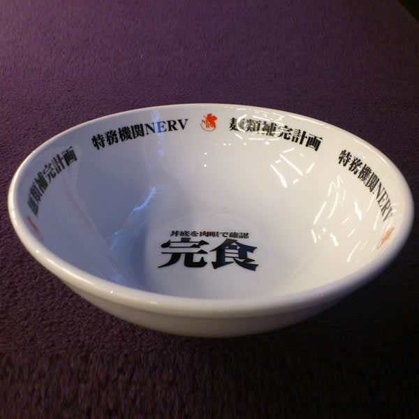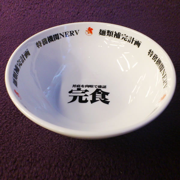 以白色的陶器製作,印上字樣包含 :「麵類補完計畫」、「特務機關 NERV 」在碗的邊緣;並在碗底寫上「丼底肉眼確認 完食」,讓吃完拉麵的各位可以體驗不同於一般拉麵碗的感受 ( 雖說動畫劇情完全沒有在 NERV 裡面吃拉麵的場景阿 XD )。