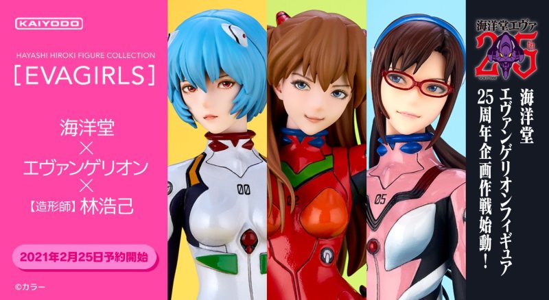 日本海洋堂玩具公司為慶祝《新世紀福音戰士》電視動畫放送 25 週年,特別展開 海洋堂 x EVANGELION x知名原型家林浩己三方合作的「EVA GIRLS」特別企劃,將劇中人氣女性角色立體化,推出「明日香」、「真希波」以及「EVA GIRLS 綾波零」1/7比例模型,預計將於 2021 年 2 月 25 日開始預購!預計將於 09 月發貨。
