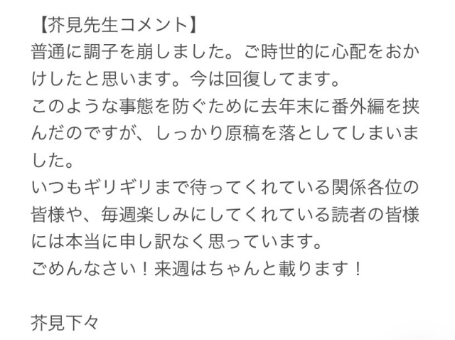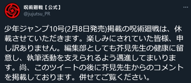 而原作者芥見下下也在《咒術迴戰》的官方推特上釋出了本人的留言訊息:「只是普通的身體不舒服而已,不好意思給各位添麻煩了,現在正在恢復中。為了防止這樣的事態發生,去年末就夾雜了兩話的番外篇,但是結果還是無法準時繳交原稿。對於一直等待著我的各位相關人士,以及每週都期待著本作的讀者們,我真的感到非常抱歉。對不起!下週我會好好刊登的。」