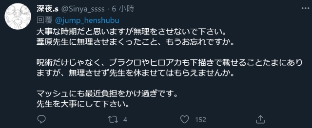 在這種重要時期希望不要太勉強自己,勿忘《境界觸發者》的葦原老師就是太勉強自己才會累倒。不只是《咒術迴戰》,《黑色五葉草》跟《我的英雄學院》也很常繳交草稿就直接上連載,希望這幾位都不要太過操勞自己,多休息一點吧。《肌肉魔法使》最近也是給自己太多負擔了,請老師多注意一下身體。