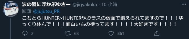 這邊已經被《HUNTER×HUNTER 獵人》跟《玻璃假面》鍛鍊過了!!請好好休息吧!!因為很有趣所以會等待的!!最喜歡了!!!