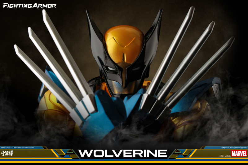 「Fighting Armor 金鋼狼」可動人偶,尺寸全高約 165 mm,在金鋼狼漫畫中經典的黃藍配色戰服中注入大量的金屬、機械元素,以鋼鐵風格呈現金鋼狼的狂野與霸氣!戰甲外觀承襲千值練一貫精細的造型和多層次塗裝,合金材質的使用更讓整體呈現出堅實的厚重質感!採用全新的可動設計,追求有如人體的關節位置,能自然地擺出最接近真人的動作,讓盔甲俐落而不會有笨重感。換上招牌的亞德曼金屬鋼爪替換手勢零件,可以重現超帥戰鬥姿態~
