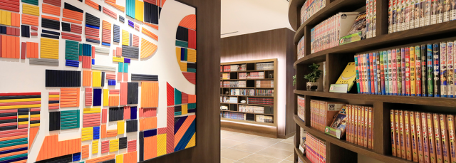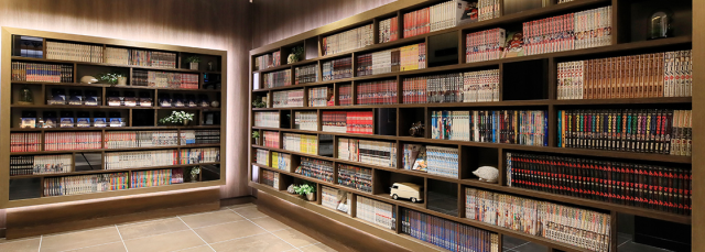 可以看到接待大廳旁就是宛如圖書館的收藏,書架上放滿了各式各樣的漫畫,提供給前來的旅客觀看。目前提供服務包含讓住宿的旅客可以隨時免費的觀看各式書籍,也提供只需觀看漫畫的消費者,以小時計費的方式觀看想看的書籍。
