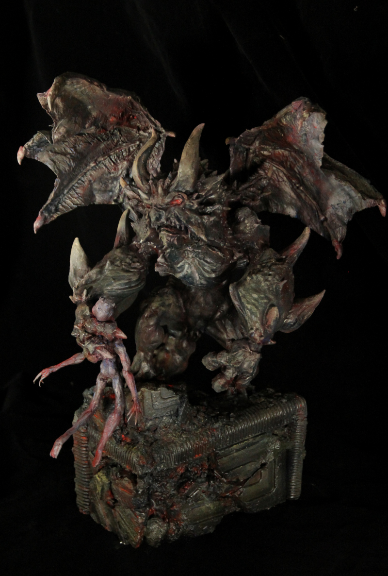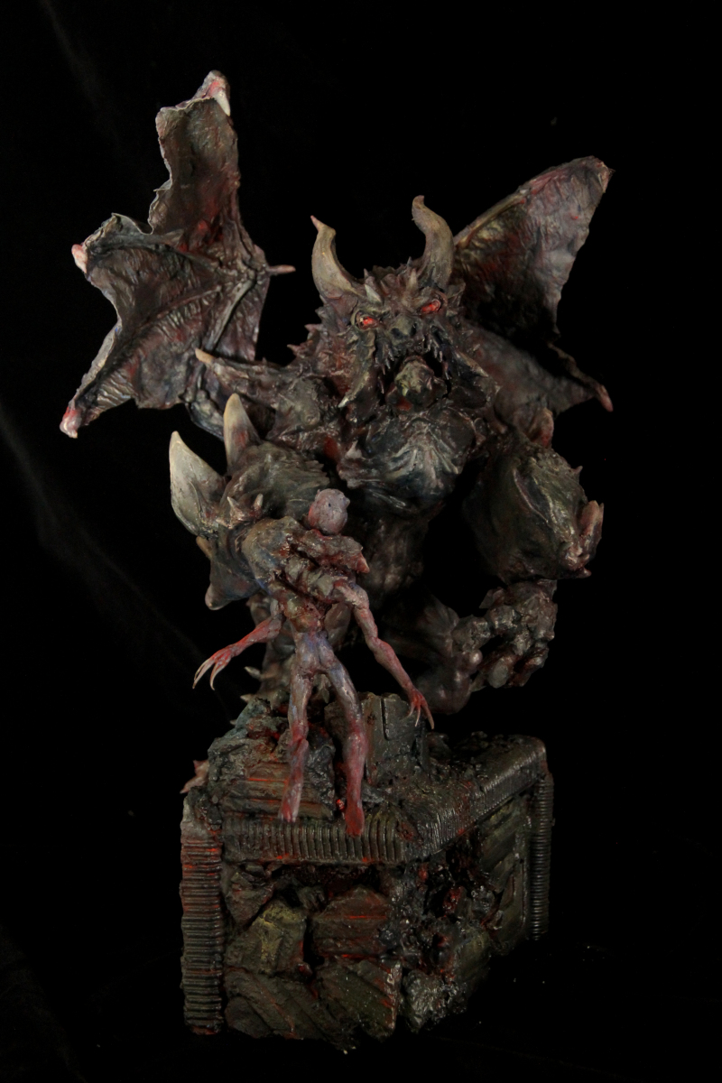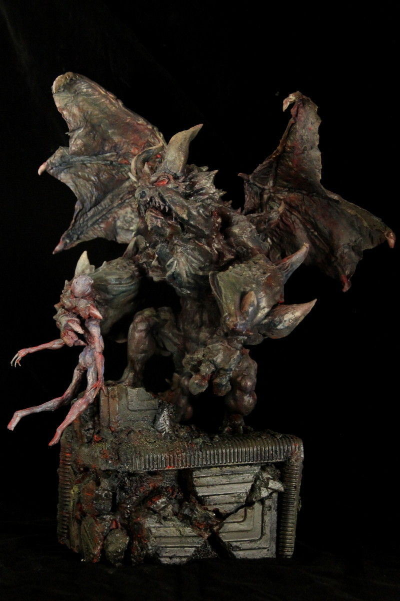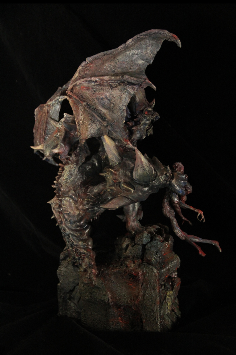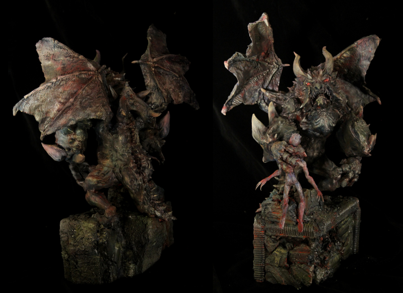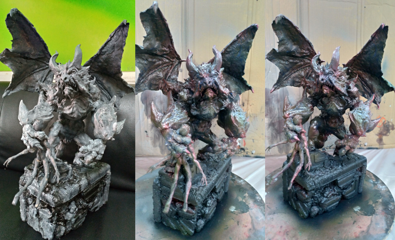 這次的製作以數位雕刻為基礎,嘗試把童年的夜行神龍Gargoyles卡通角色具象的立體呈現出來。其實卡通內容也忘了差不多了,只記得石像鬼是行俠仗義的夜晚守護者,前一陣子巴黎聖母院的焚毀屋頂上那幾尊鐘樓怪人不知道是否也受損了。作品呈現石像鬼守護在屋頂上,將侵入的惡鬼一把抓住的場景呈現,在製作石像鬼時思考最久的是塗裝呈現的方式,原本以石像鬼來說,應該是石頭的質感加上一些水漬、苔癬與鳥大便,但這樣看起來一點也沒啥威嚇感了!所以參考類似炎魔的色彩呈現,並用粉彩增加砂石的效果感。場景前端增加多以點血紅的點綴裝飾,輔以綠色與灰色粉彩混色增加石牆的差異性,惡靈用比較淺的色彩效果,運用紅色與藍色增加比較原始的生物感。