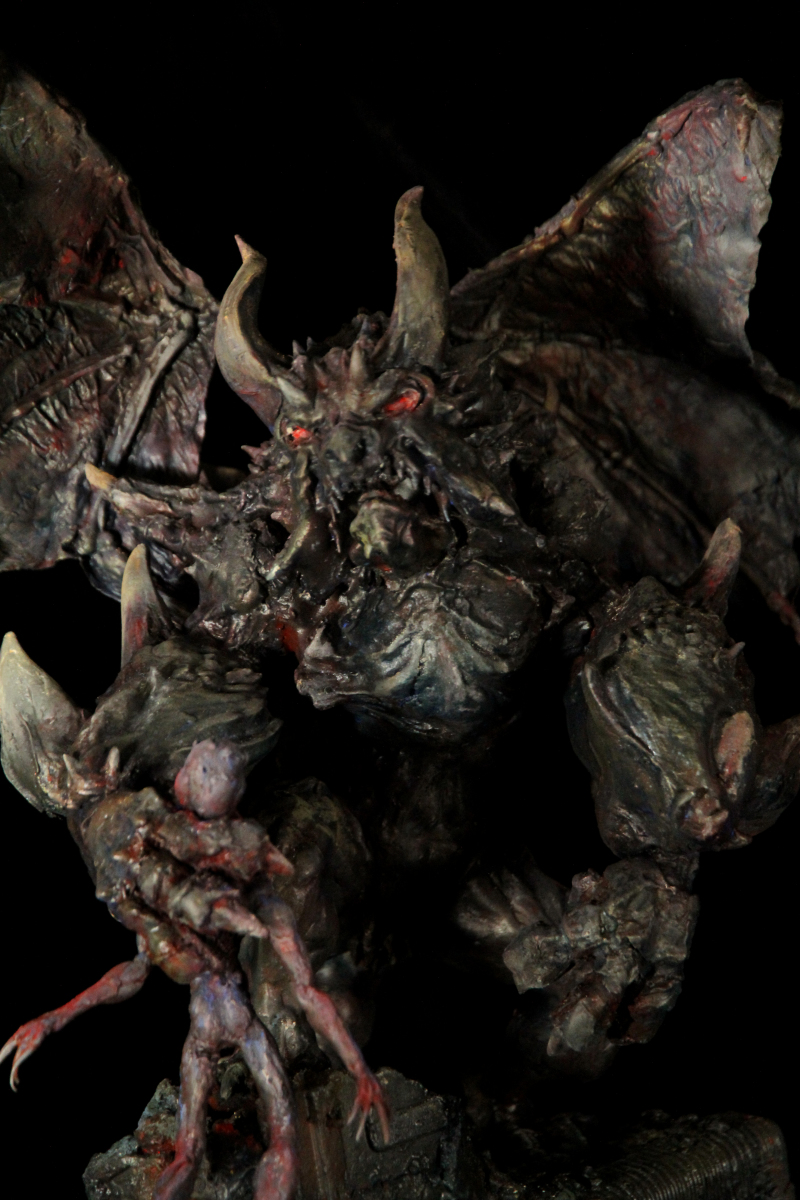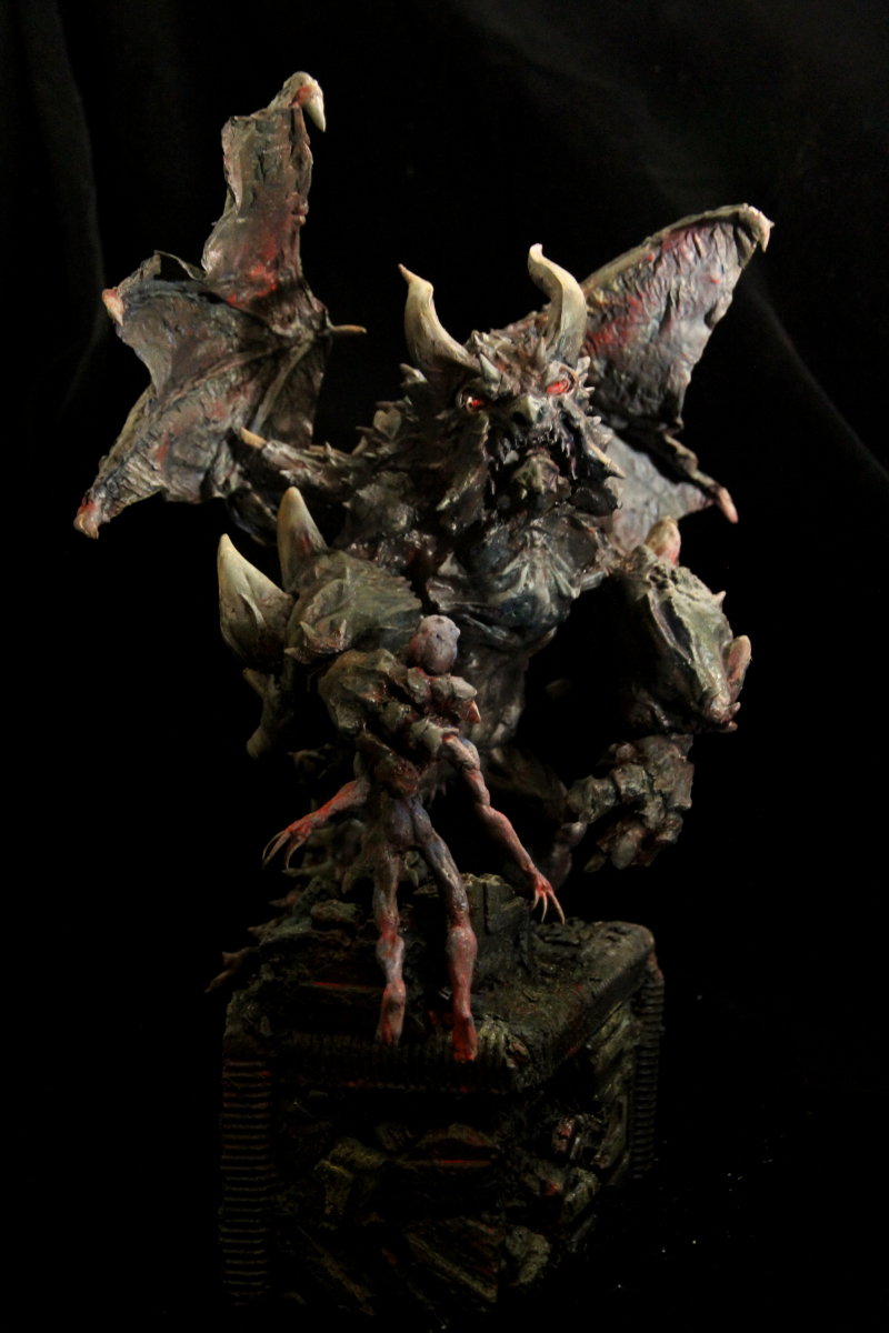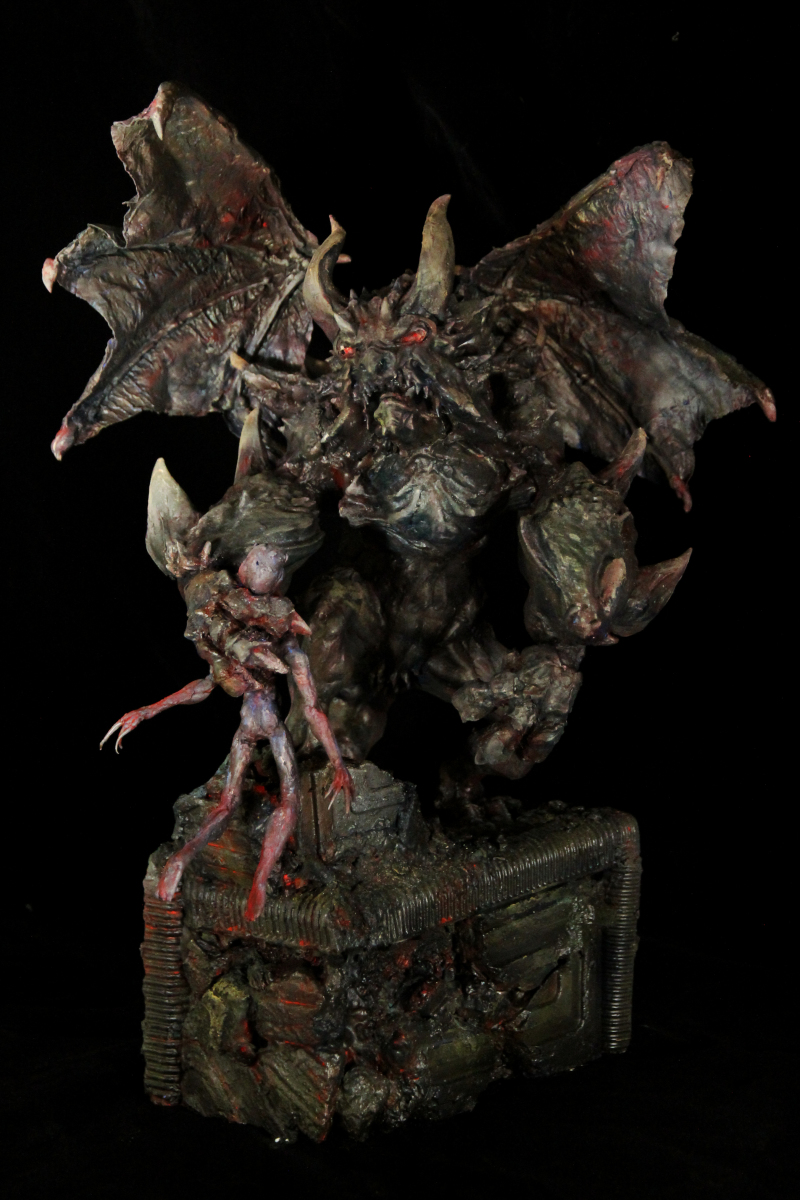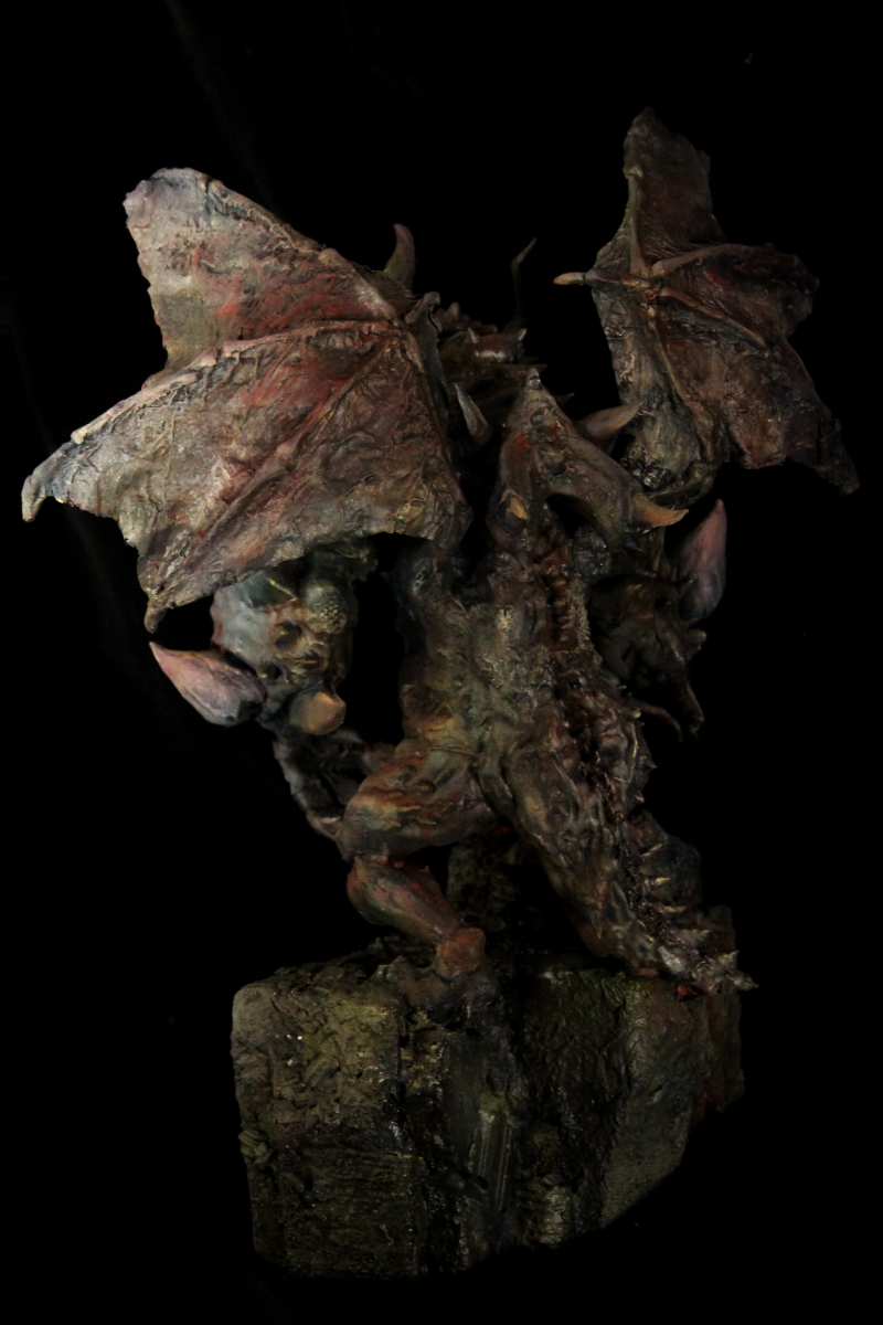 這次的製作以數位雕刻為基礎,嘗試把童年的夜行神龍Gargoyles卡通角色具象的立體呈現出來。其實卡通內容也忘了差不多了,只記得石像鬼是行俠仗義的夜晚守護者,前一陣子巴黎聖母院的焚毀屋頂上那幾尊鐘樓怪人不知道是否也受損了。作品呈現石像鬼守護在屋頂上,將侵入的惡鬼一把抓住的場景呈現,在製作石像鬼時思考最久的是塗裝呈現的方式,原本以石像鬼來說,應該是石頭的質感加上一些水漬、苔癬與鳥大便,但這樣看起來一點也沒啥威嚇感了!所以參考類似炎魔的色彩呈現,並用粉彩增加砂石的效果感。場景前端增加多以點血紅的點綴裝飾,輔以綠色與灰色粉彩混色增加石牆的差異性,惡靈用比較淺的色彩效果,運用紅色與藍色增加比較原始的生物感。