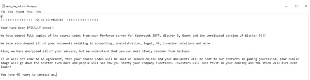 根據CDPR所公開的勒索信件內容表示,對方要求該電玩開發公司必須在48小時內聯絡寄件人,若是不按照信忠條件執行駭客所要求內容的話,就會將CDPR內部所有機密文件,包含《電馭叛客 2077》、《巫師3》(The Witcher 3: Wild Hunt)、《昆特牌》(Gwent: The Witcher Card Game)等遊戲資料,以及財務管理相關、投資機密等文件全數對外曝光。