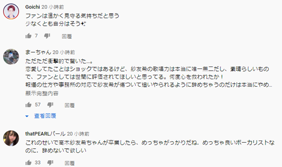 「文春週刊」在11日經過文章與影音媒體投放後引發軒然大波,隔日(12)高木紗友希便表示不再進行演藝活動,而同為實力派天團的Juice=Juice隊長金澤朋子在文辭中難掩情緒,描述「這八年來的相處的感觸」,並對這次的閃退結果深感失落,而「自己別無選擇只能繼續努力」。