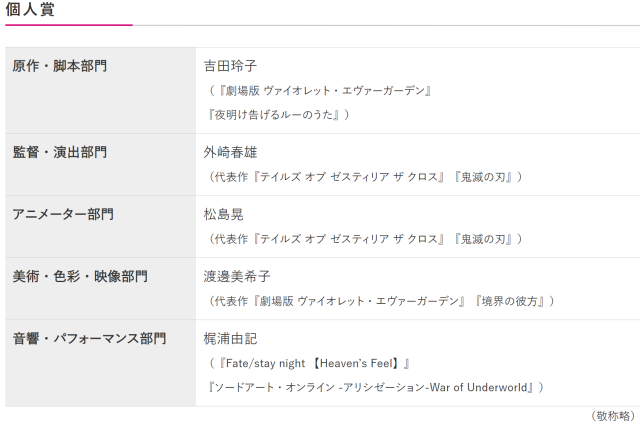除此之外,也包含動畫製作單位的「個人賞」,獲獎名單如下 :