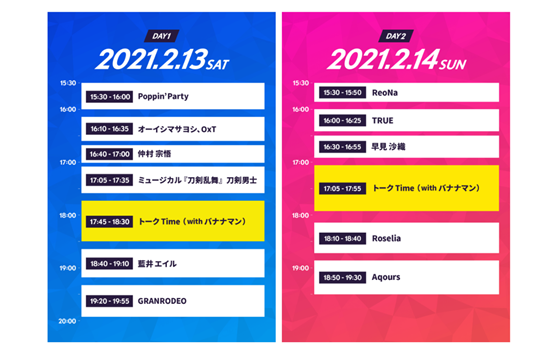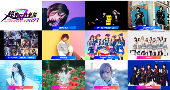 今年2021年音樂祭特別定在情人節強化話題,並在多人團體上邀請《BanG Dream!》的2.5次元樂團「Poppin’Party」和「Roselia」帶來高人氣歌曲、《Love Live! Sunshine!!》的「Aqours」一併共歡,當然也沒有錯過《刀劍亂舞》的12位刀劍男子出陣,(小狐丸 / 今剣 / 大和守安定 / 和泉守兼定 / 堀川国広 / 長曽祢虎徹 / 蜻蛉切 / 陸奥守吉行 / 巴形薙刀 / 明石国行 / 鶴丸国永 / 篭手切江)可說是相當有誠意。