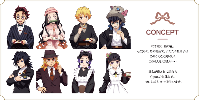 本次融合 Q-pot. 的風格將人物服裝重新設計,可以看到戴上眼鏡的炭治郎跟穿上洋服的禰豆子,更有穿上西服的義勇跟杏壽郎,還有小編最愛的胡蝶忍與香奈乎都穿上女僕裝,真的好香阿 XD。