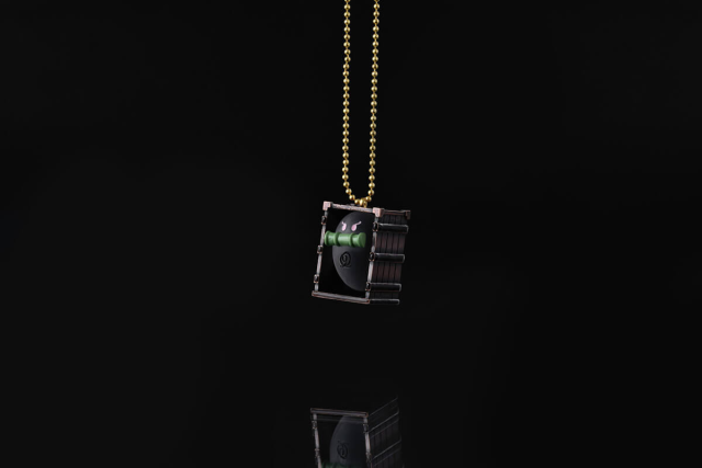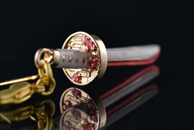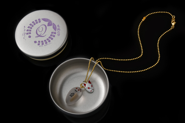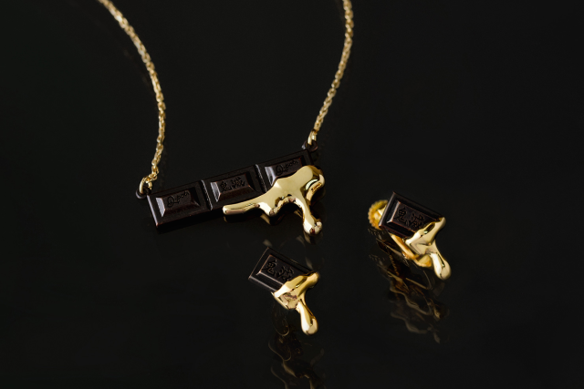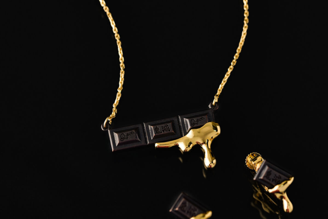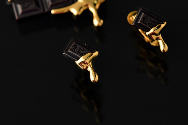 以巧克力的形象設計,上面寫上鬼滅兩字,以金色的項鍊與裝飾點綴,以精細的工法成型。項鍊售價為 14,300 日圓,耳環則為 7,700 日圓。