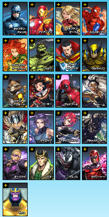 本次的合作圖面主要參照美漫中的形象設計,並非與 MCU 電影中真人演出的樣貌呈現,以下為所有公布的抽蛋角色。