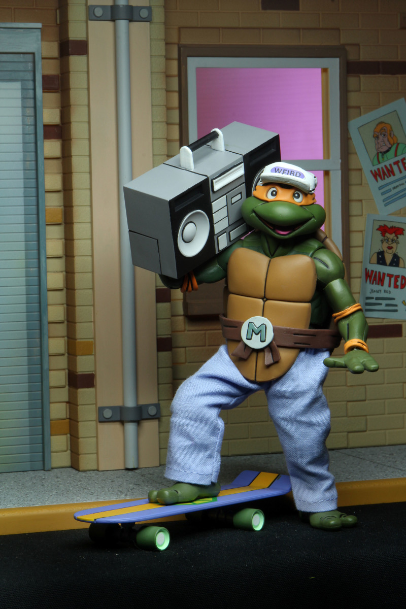本次的「偽裝中忍者龜 四人包」包含了身穿偵探大衣、淡藍色長褲的神龜四兄弟,除了高度還原元祖動畫造型設定的可動人偶本體之外,配件也十分豐富,像是獨立的紳士帽、不同表情的忍者龜頭雕、偽裝成人類的頭雕、各式武器、替換手、滑板......等,而且還有一頂「WEIRD」字樣的鴨舌帽,不知道各位玩具人對於許瑞德在不知情的狀況下雇用偽裝的米開朗基羅當作「Weird Pizza To Go」外送員的片段有沒有印象XD!