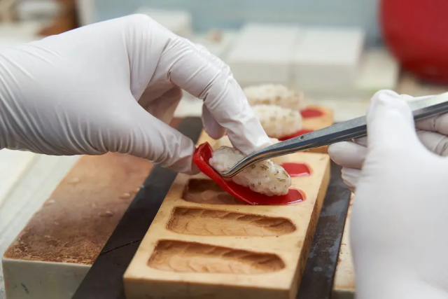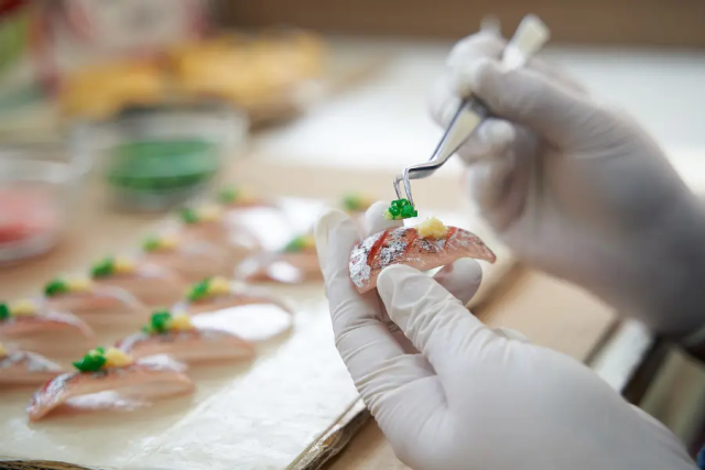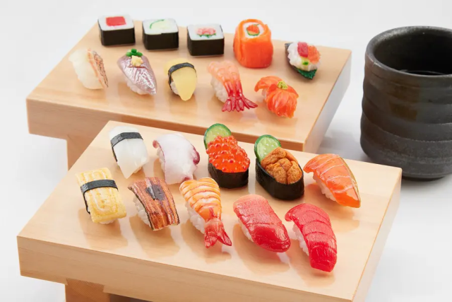 壽司樣品模型是用真正的壽司開模製成的,另外在著色上使用了多種顏色調配展現出食物的原貌外,更忠實地表現出新鮮材料的光澤。即使您仔細觀察,它也是具有極高完美度的作品,與真正的壽司幾乎無法區分。