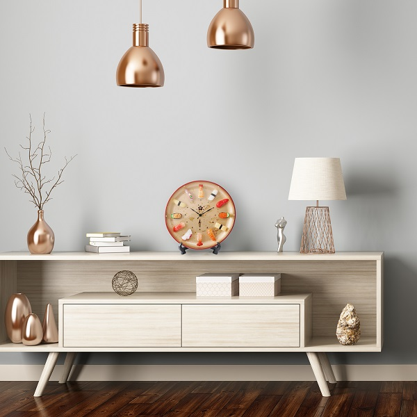 整個壽司時鐘看來,不僅可以放置在房屋中當擺設,可以融入日式風格建築外,放入西式現代風格房屋內也可以作為一個畫龍點睛的存在。