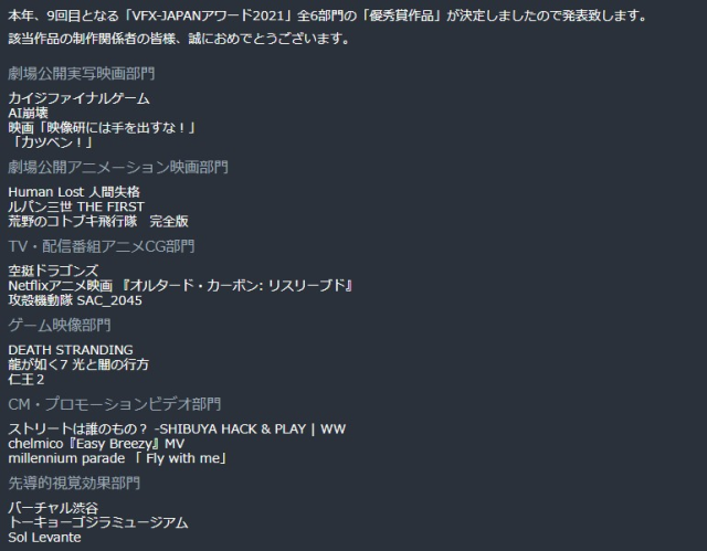 2011年組建而成的日本行業協會《vfx-japan》,自2013年來長期表彰在視覺領域上有所貢獻的作品,從真人電影、3D動畫電影、動漫節目、3A遊戲、影視廣告、特效部門等處都有所評選(以下為本次速報名單)