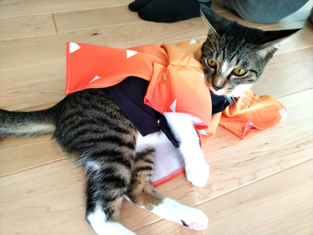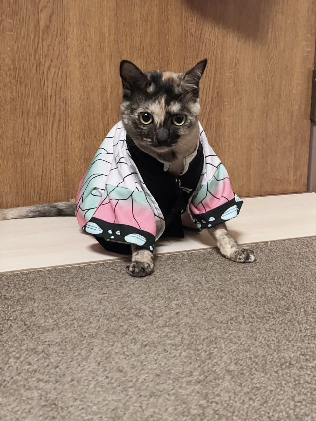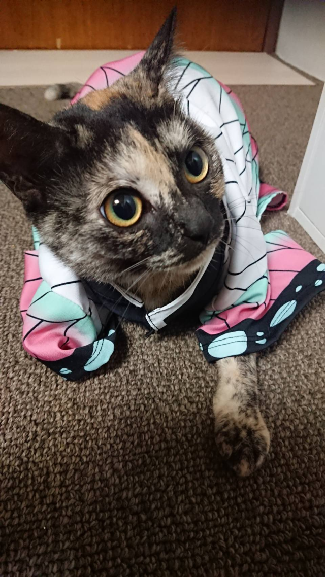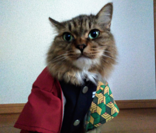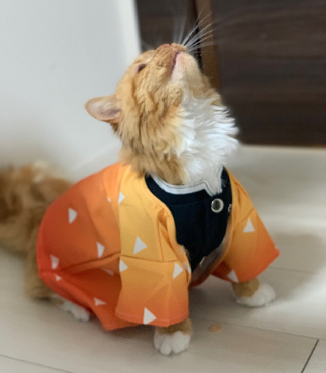 看看這可愛的模樣,各位貓奴們心還不被融化嗎 XD。穿上羽織服裝真的很可愛,不知道台灣有沒有店家特製貓咪或狗狗的鬼滅寵物衣來給家中寵物穿一波~ ( 或許官方也會看到這個商機出一波,福音戰士都出過了 XD )