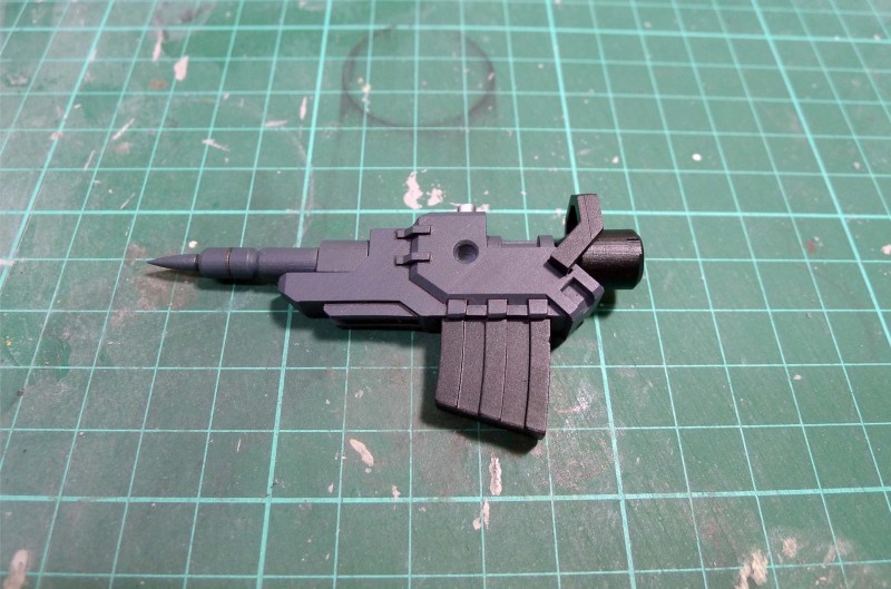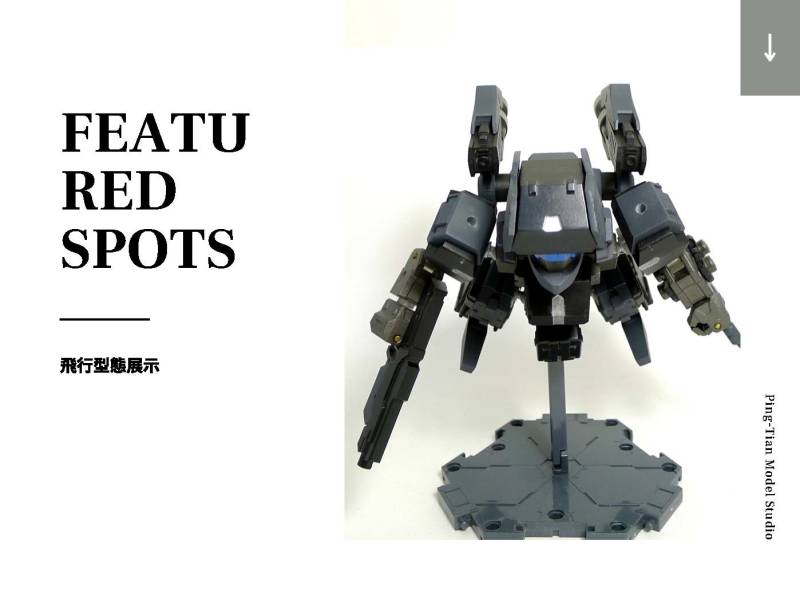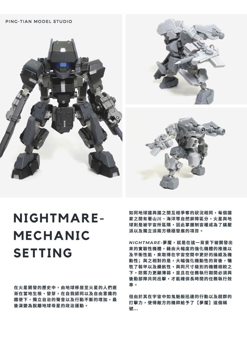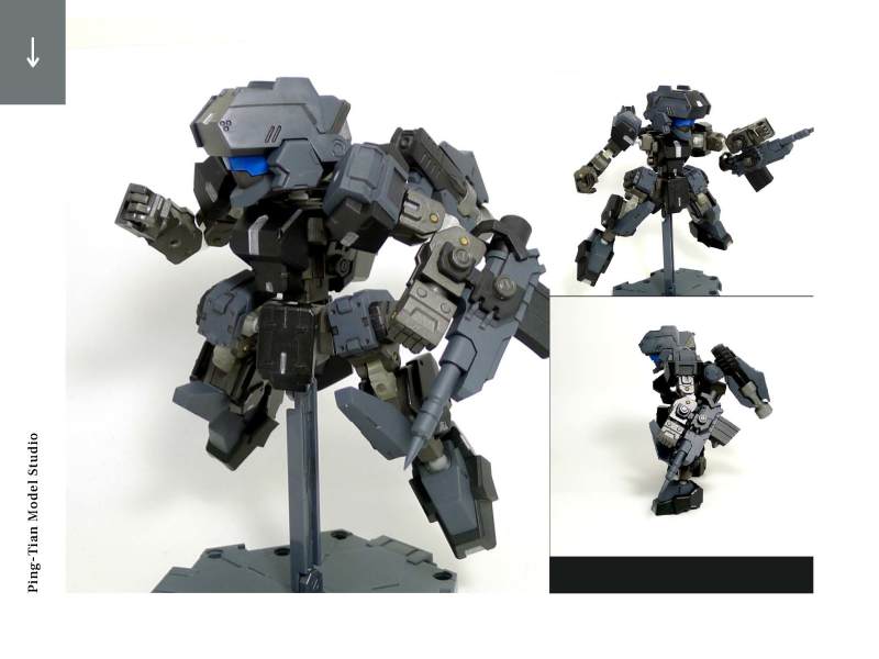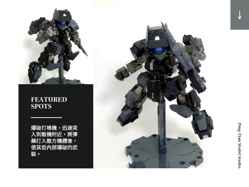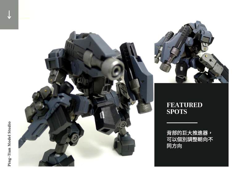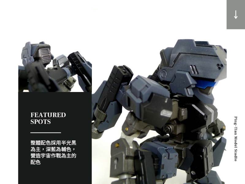 以上是這個作品的機體設定,由於設定為宇宙用機體,在配色的採用上以MR Color 33的半光黑為主,輔以TAMIYA TS-48的消光槍管灰,骨架的部分採用MR COLOR 28的槍鐵色,整體看起來接近迪坦斯系列的配色;