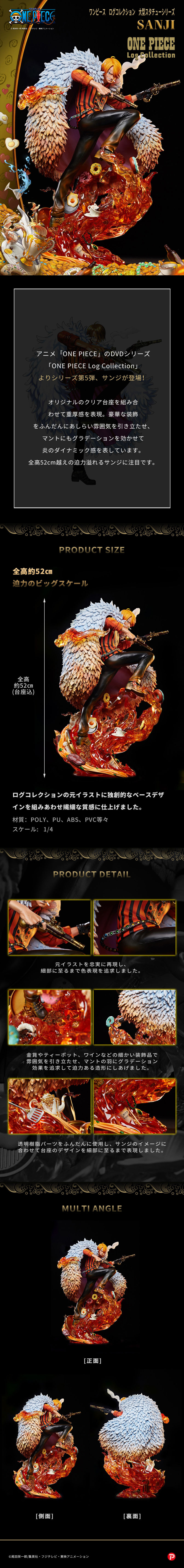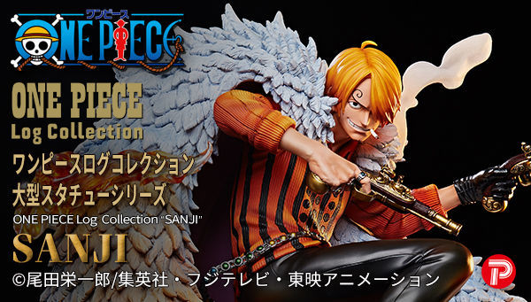 以《航海王》動畫 DVD 封面插畫為基礎製作的「ONE PIECE Log Collection」系列,採用 1/4 比例的大尺寸將作品精緻呈現,更以複合材質 POLYSTONE、PVC、ABS、銅、電鍍零件等精緻地打造各部質感。「ONE PIECE Log Collection 香吉士」1/4 比例大型雕像,尺寸全高約 52 公分,將插畫中雙手持槍的香吉士華麗打造!