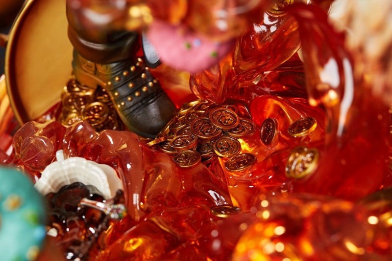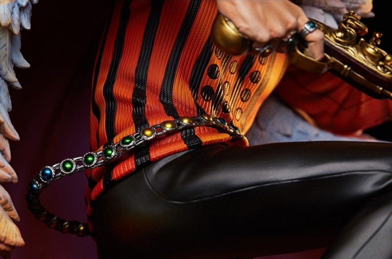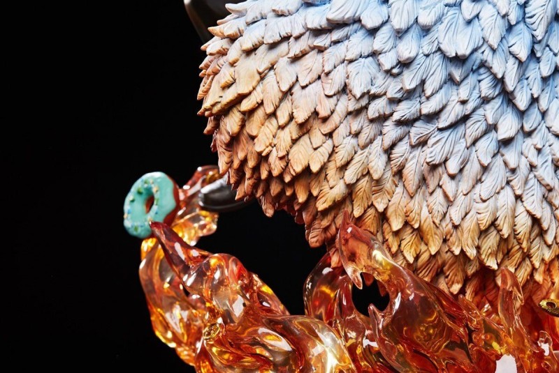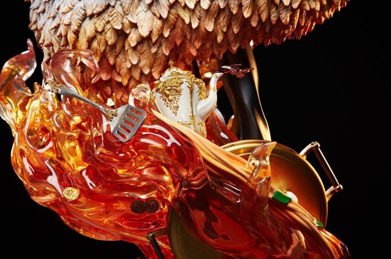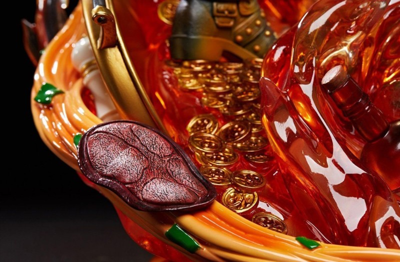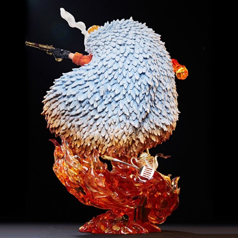 還原香吉士臉上帥氣的笑容、特色眉毛以及叼著菸的招牌表情,身上一襲厚重貴氣的羽毛披肩與金屬配件皆細細刻劃,展現十足氣勢;在充滿躍動感的修長腿部之下,更是精心塑造了金幣、廚具、酒瓶與和荷包蛋、牛排、甜甜圈等廚師元素的細節。搭配熊熊燃燒的火焰特效底座,整體也施以被火光照亮的漸層色塗裝,從各角度欣賞都能感受到作品令人驚嘆的華麗與精彩豐富細節!