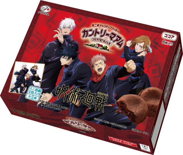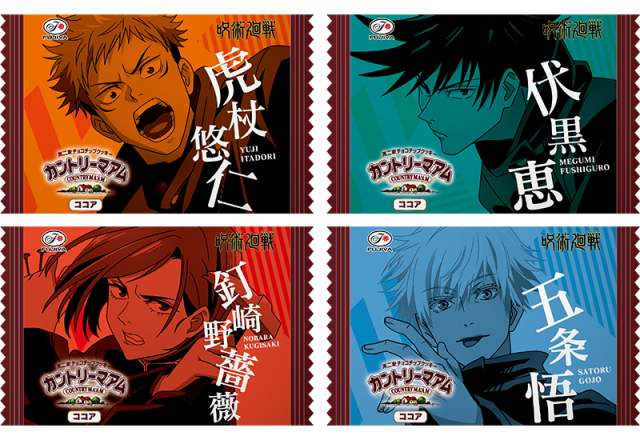 巧克力鄉村餅乾內含四種包裝,分別虎杖悠仁、伏黑惠、釘崎野薔薇與五條悟的圖像。裡面更贈送一張迷你色紙,有五款隨機出貨。