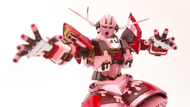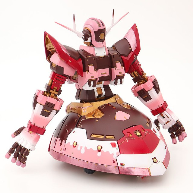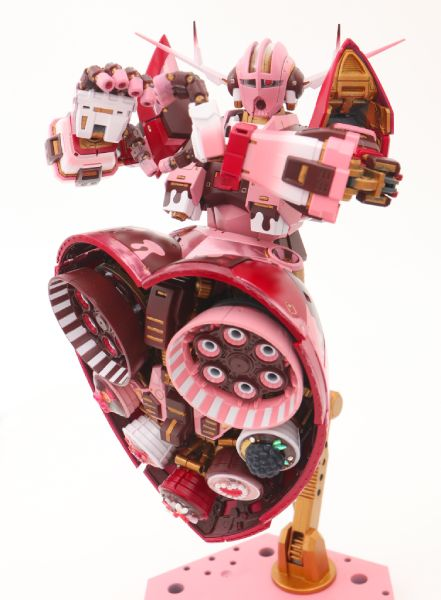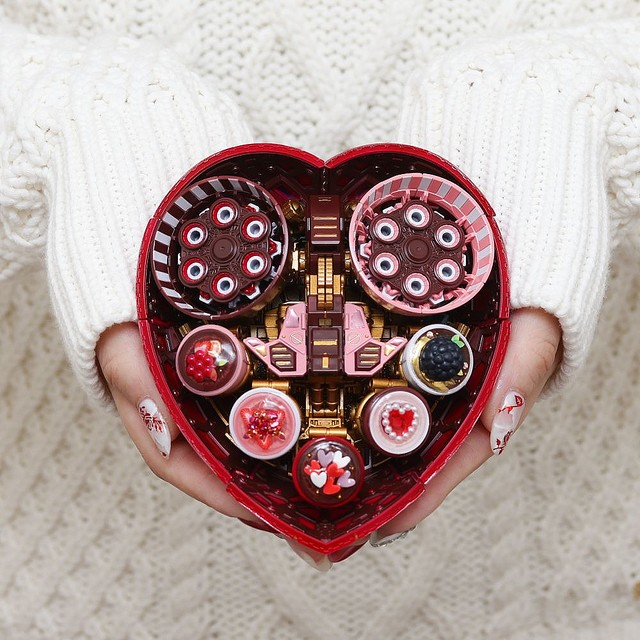 這位日本的模型收藏家飴しば(@ame_shiba)製作了一隻充滿「少女風」,或者該說「情人節風」的「吉翁克」,不管從機體正面、背面、手腳都是粉色和紅色,非常適合在告白時當禮物送出,而且從它的底部來看簡直就是盒「心型巧克力禮盒」,如果就這樣送給心上人可能會100%成功吧?