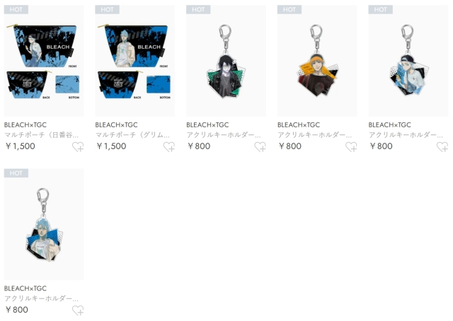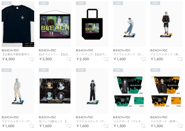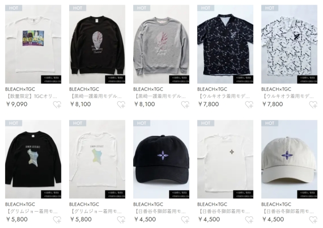 這次《BLEACH 死神》與「東京女孩展演 TGC」合作,久保帶人所特別繪製的插圖內合作角色有四位,分別是黒崎一護、日番谷冬獅郎、烏爾奇奧拉·西法、葛力姆喬·賈卡傑克,這四位劇中的高人氣角色。這次的合作服飾將會在「第32回 マイナビ 東京ガールズコレクション 2021 SPRING/SUMMER」的直播走秀中展示。而角色身上穿著的衣服當然也會正式商品化,並且也已於 2 月 22 日在 TGC ONLINE STORE 線上商店中開始預約販售。除了服飾外還有立牌、鑰匙圈、胸章等等商品進行販售。