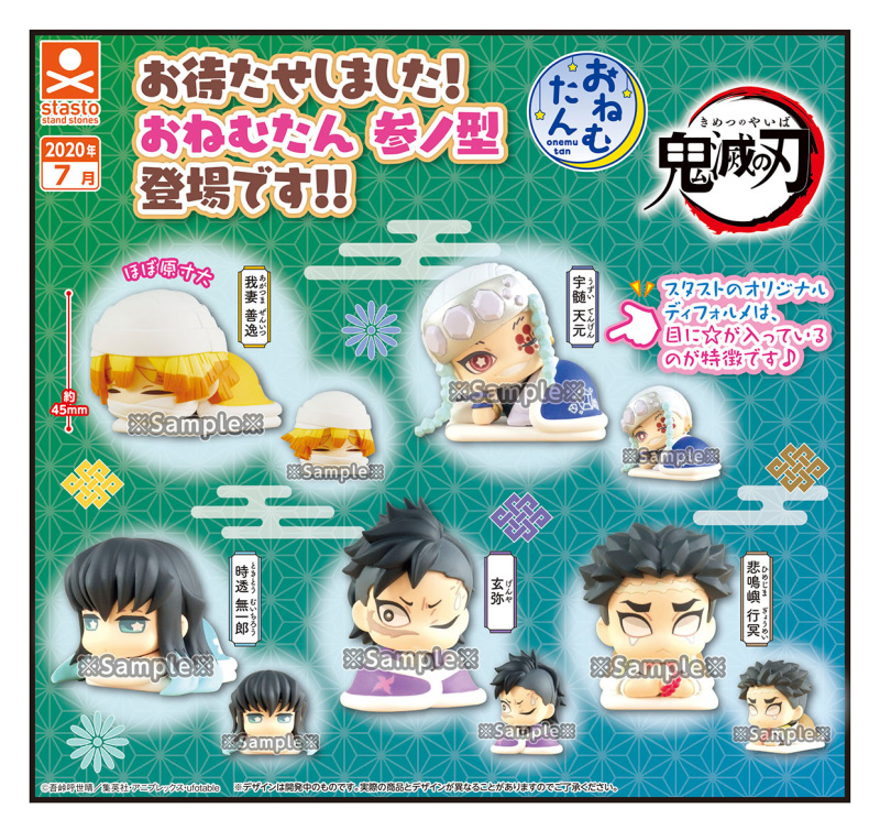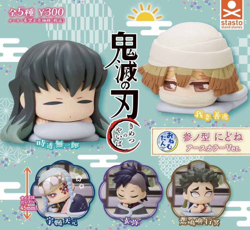 日本知名玩具公司「STAND STONES」(スタンド・ストーンズ,stasto)所發行的「《鬼滅之刃》愛睏睡覺造型轉蛋(おねむたん)系列,繼推出好評的 壹之型、貳之型、參之型、肆之型後,大人氣擋不住,又將推出新色「愛睏睡覺 參之型 回籠覺 大地色調Ver.」轉蛋,一共五種款式,每轉 300 日幣,於 2021 年 02 月中旬販售。