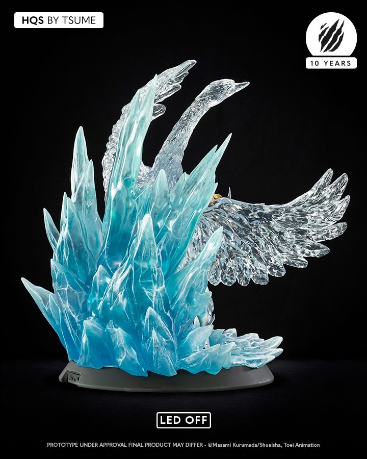 站在覆蓋著霜凍的半透明冰峰特效件之中,身後更是華麗飛舞的精緻透明天鵝,如冰晶般剔透且帶有細膩稜角,整體兼具魄力與美麗!底座更是有七彩的LED光效,水瓶座最大奧義產生七彩極光色的凍氣。