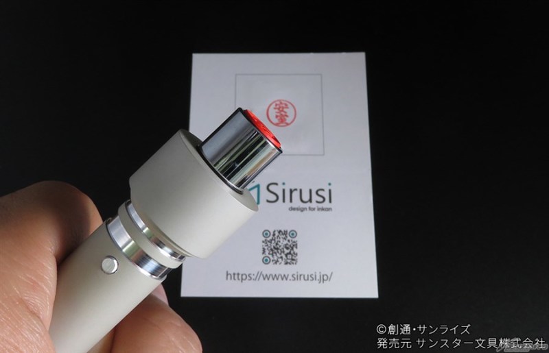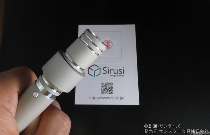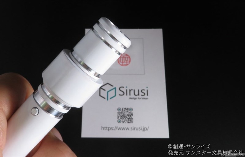 全長約 11 公分的「光束軍刀造型姓名印章」以 RX-78-2 鋼彈所配備的光束軍刀造型製作,使用鋁合金材質施以白、灰色塗裝,留下環形凹槽的金屬質感,表現出設定中虛構金屬「月神鈦合金」的質感,每件商品皆經過東京都大田區工廠職人之手,細膩進行表面處理。