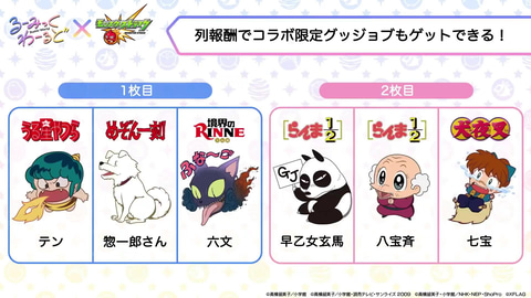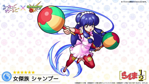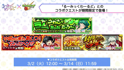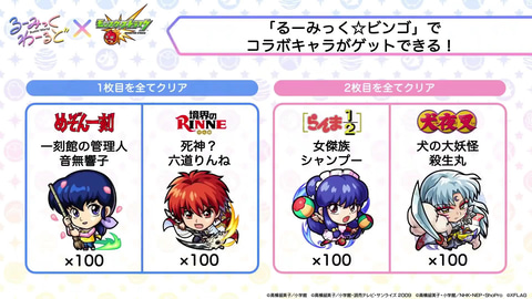 這次登場的合作角色有《福星小子》的拉姆、《相聚一刻》的音無響子、《亂馬1/2》的早乙女亂馬、《犬夜叉》的犬夜叉、《境界之輪迴》的六道輪迴,以及《亂馬1/2》的珊璞和《犬夜叉》的殺生丸,分別都可以在各自的關卡和賓果任務中取得。