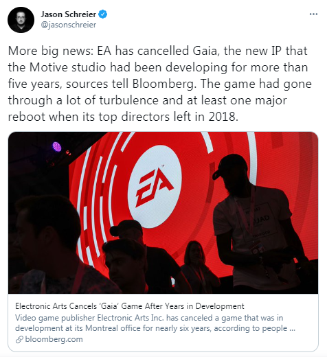 由彭博社(財經資訊公司)記者Jason Schreier報導,《EA》從2015年開發近6年的IP《GAia》中止,該遊戲從未正式曝光與宣傳,但在2020「EA PLAY」影片中有部分片段釋出,目前確定於2月取消此遊戲製作,與該公司當前宣示改版的《冒險聖歌》專案同時取消,使期待的玩家深感失落。