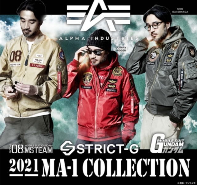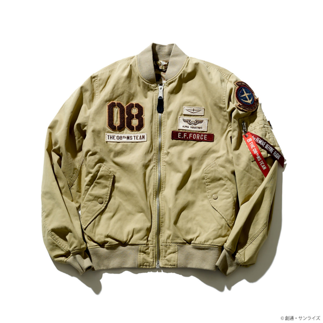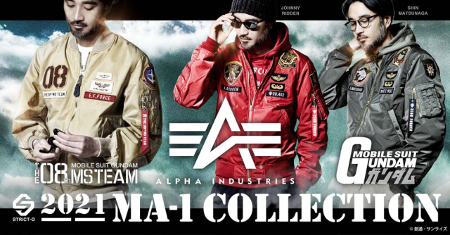 三款分別為 : 《機動戰士鋼彈第08MS小隊》第08小隊款、《機動戰士GUNDAM》 強尼‧萊登款與《機動戰士GUNDAM》松永真款。皆以輕薄款的 MA-1 作為設計,適合春天冷暖交替時著用,配上大量的布章呈現主題人物的要素,相信鋼彈粉絲看到也能認出所代表的人物與勢力。