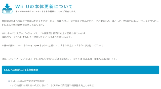 任天堂Support官方於 3 月 2 日在推特上發布了任天堂的上一代家用主機 Wii U 的更新檔「系統版本5.5.5J」可以正式開始更新使用的消息。