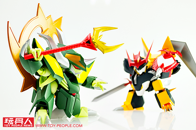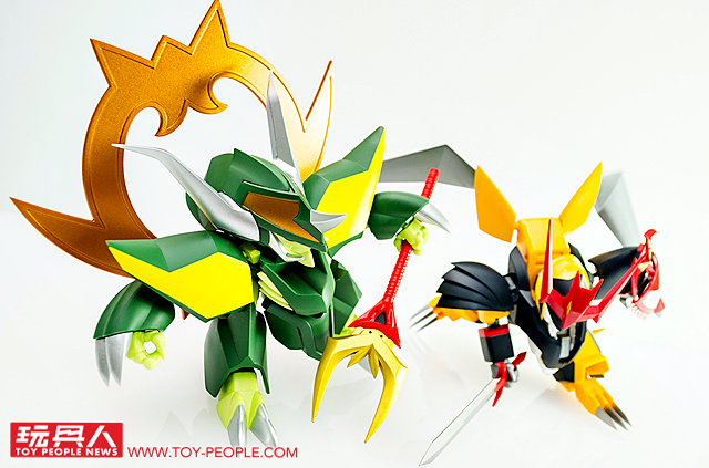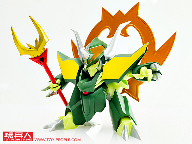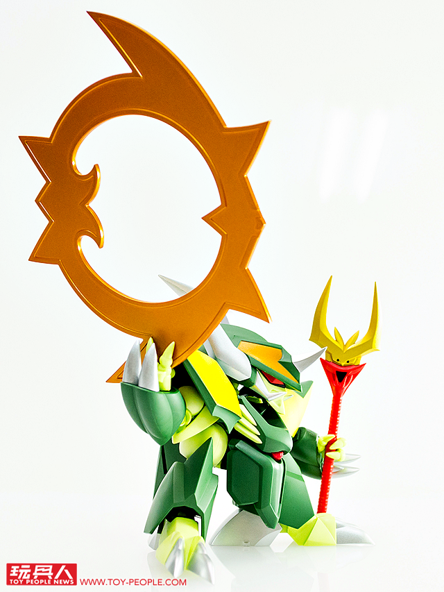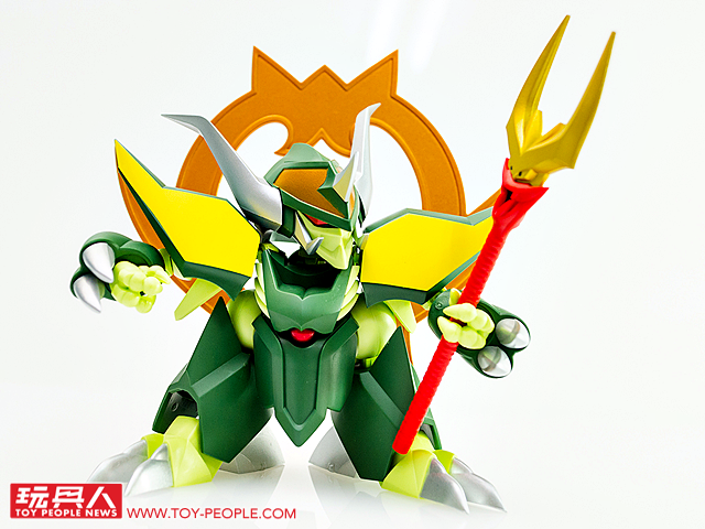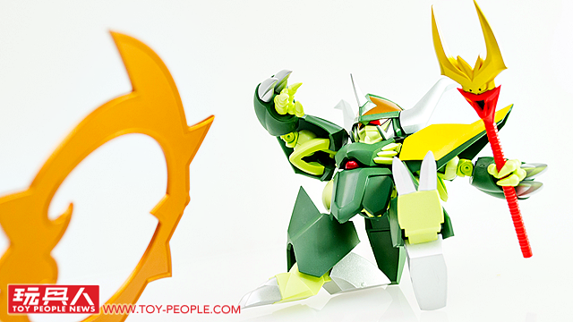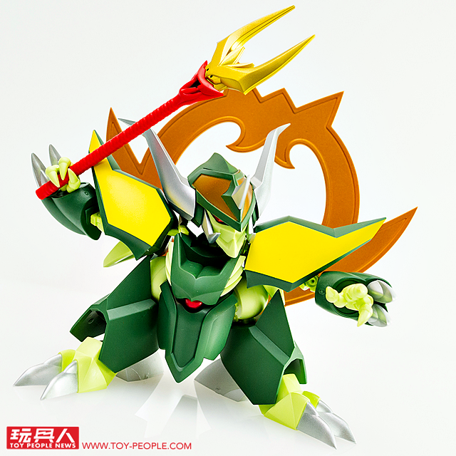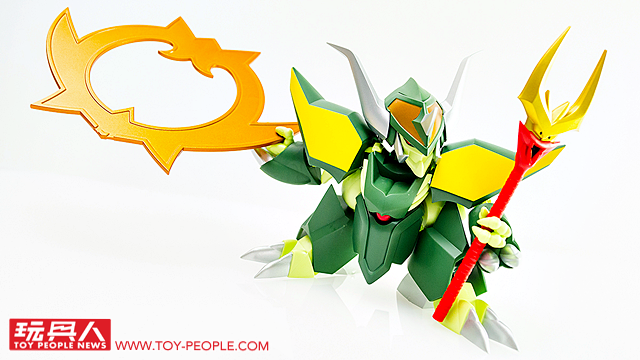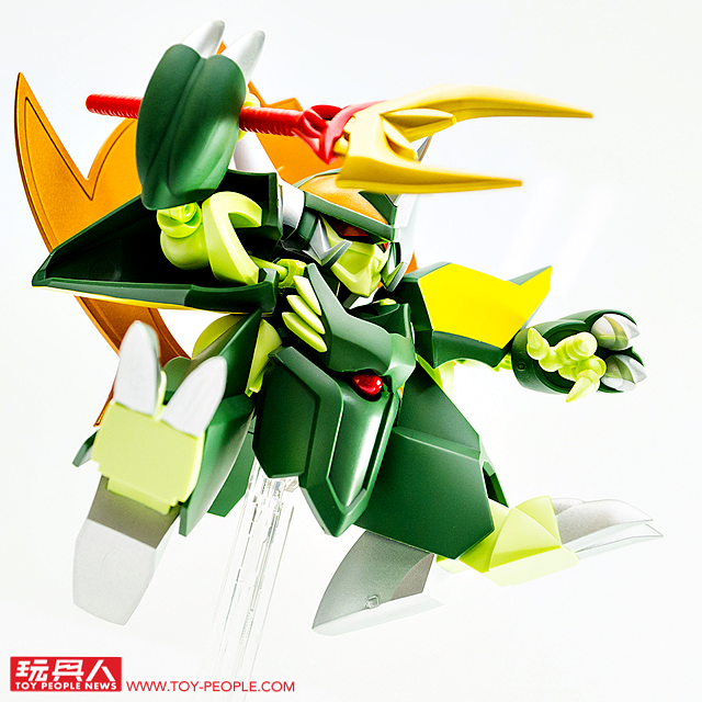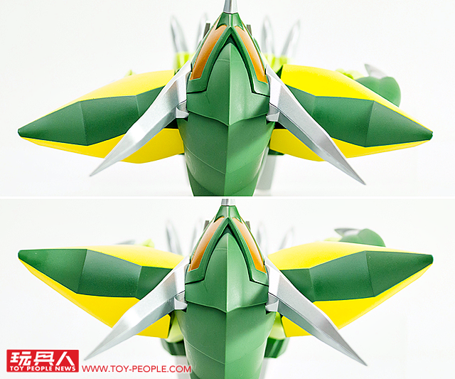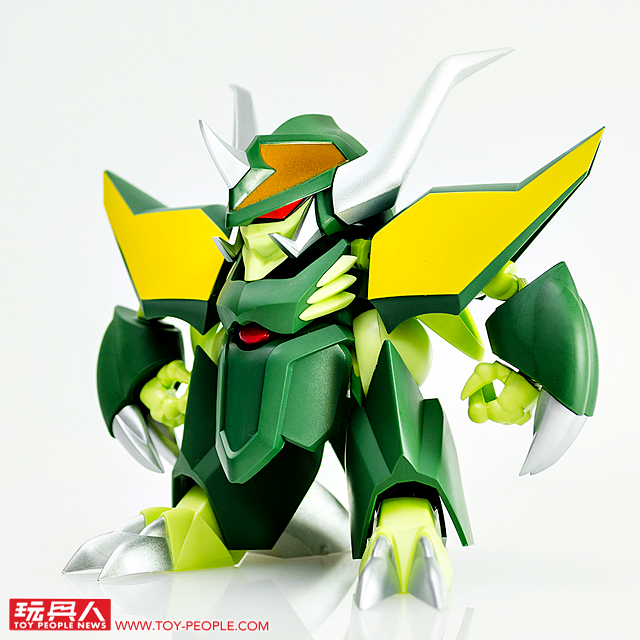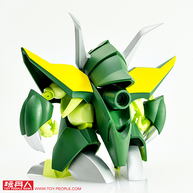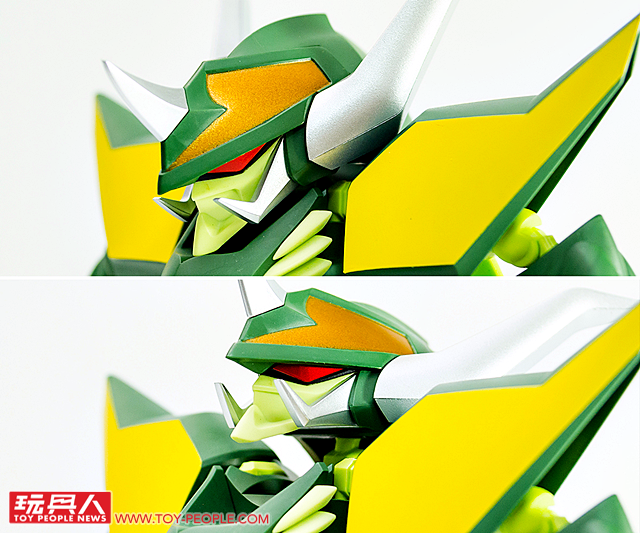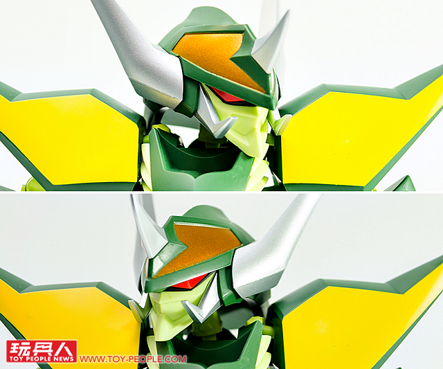 ▼ 本體則使用消光的綠色調,頭部特徵的入道角、腕部與腿部的爪都施以金屬銀塗裝,額頭的金色、紅色部位同樣也是金屬色,加強整體厚重質感。