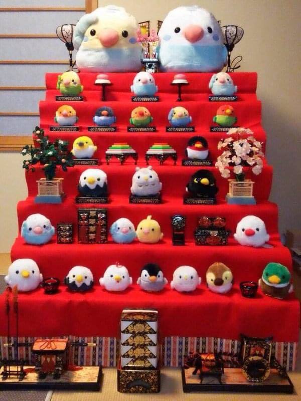 當然,也有人是將家中的肥鳥玩偶,通通擺上了階梯式檯座,第一階原本是日本天皇與皇后的位置,卻變成了兩隻超大超肥的可愛鳥兒,整體看下來更是讓人感到少女心爆發啊XD