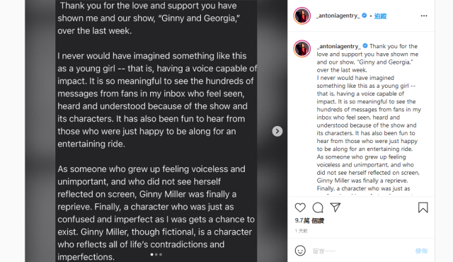 「作為一個從小感到無聲無息、不重要的人,我很少能在影視作品中與角色產生共鳴,而金妮米勒(Ginny Miller)讓我得以停下這種想法——終於有個和我一樣迷茫且不完美的角色得到了曝光的機會。金妮米勒雖然是虛構的,但卻是一個反應了生活中所有矛盾和不完美的角色。"」