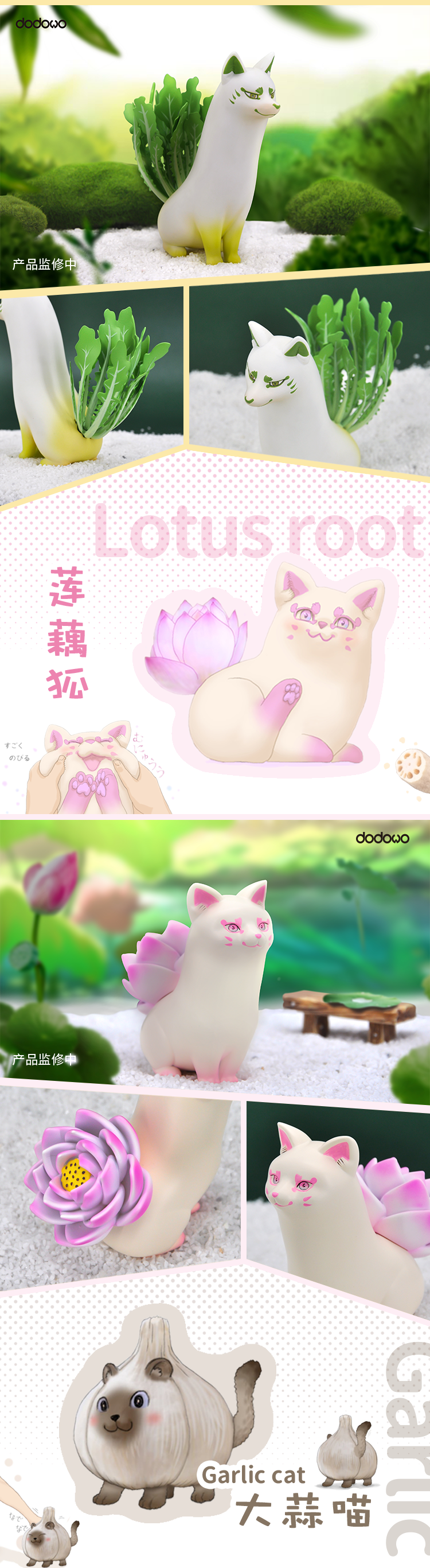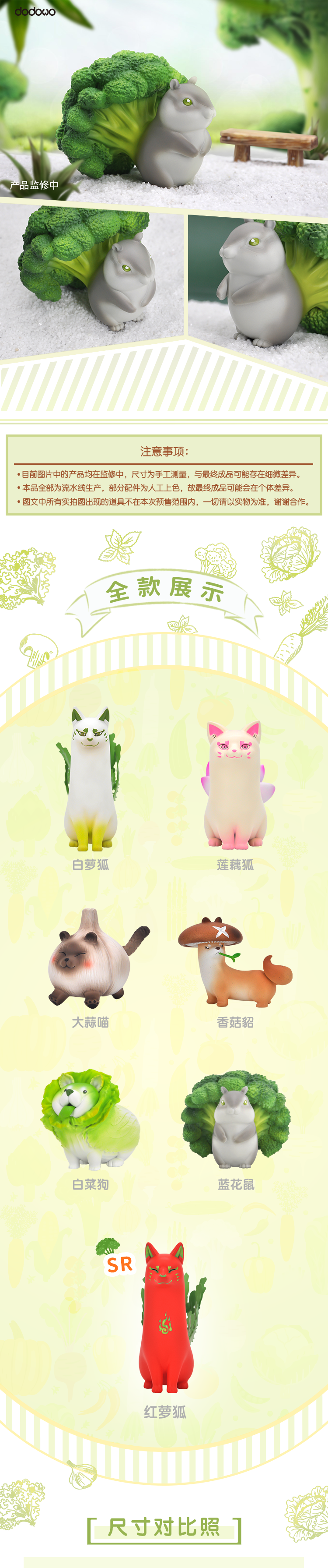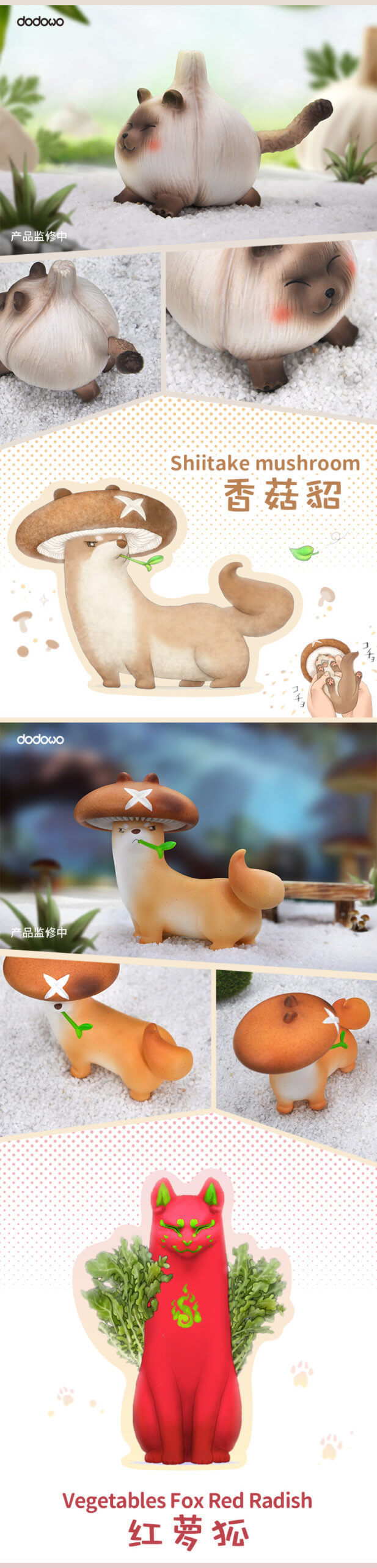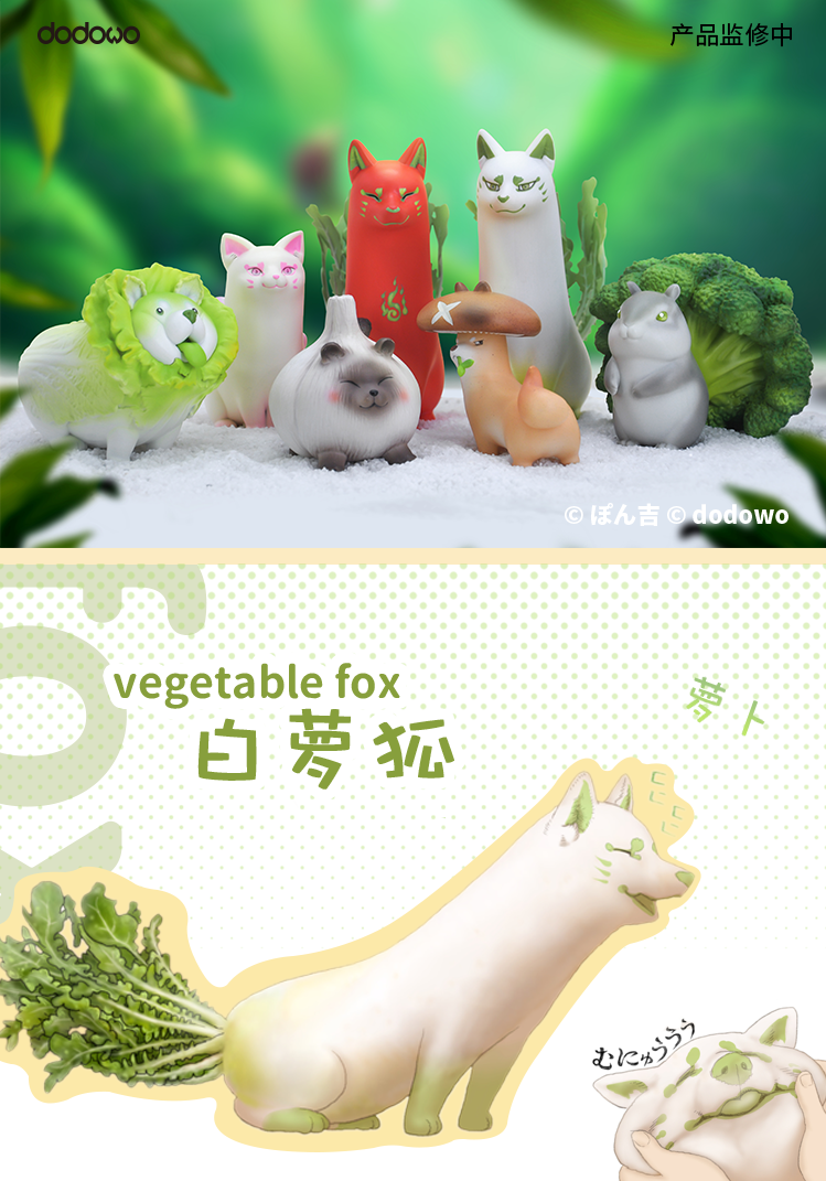 「dodowo 野菜動物妖精 第一彈 盲盒公仔」,七款已公開的陣容有:大根狐狸(白蘿蔔狐)、蓮藕狐狸、大蒜貓、香菇貂、白菜柴(白菜狗)、花椰菜松鼠(藍花鼠)以及SR等級的紅大根狐狸(紅蘿蔔狐)!各款尺寸約在 5~10 公分高,仔細將ぽん吉筆下的可愛妖精造型還原,包含蔬菜的細節與妖精們萌萌的表情都如實呈現~除了盒玩之外,於網站上還有更多集資專屬的福利,有興趣的玩具人可以到網站上逛逛唷~