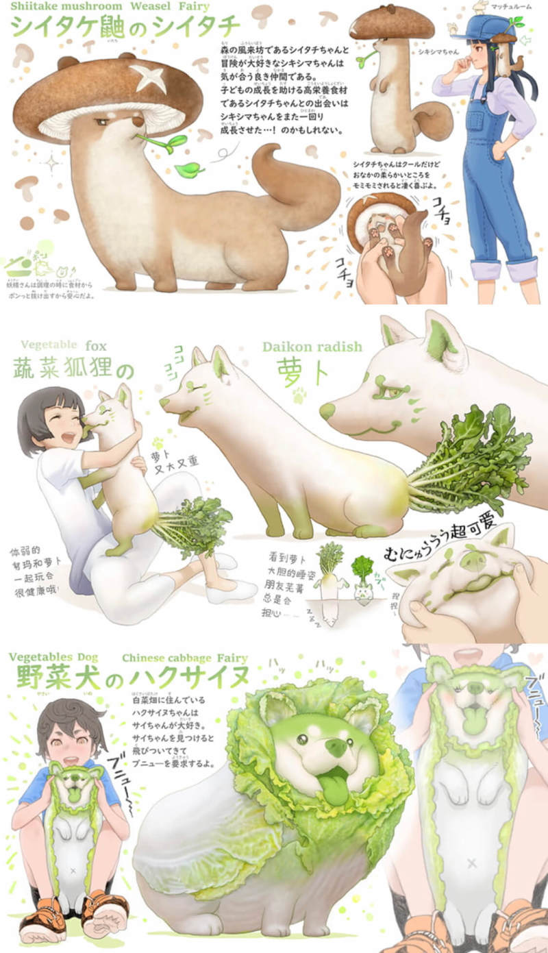 日本繪師 ぽん吉(@PonkichiM)發揮天馬行空的想像力,把動物與蔬菜水果做結合,創造出可愛又趣味的新物種-野菜動物妖精」(野菜の妖精),軟萌的模樣相當討喜,包含大人氣的「白菜柴」、「大根狐狸」、「大蒜貓」、「大頭菜豬(蕪菁豬)」等,讓不喜歡吃蔬果的小朋友都忍不住被征服~
