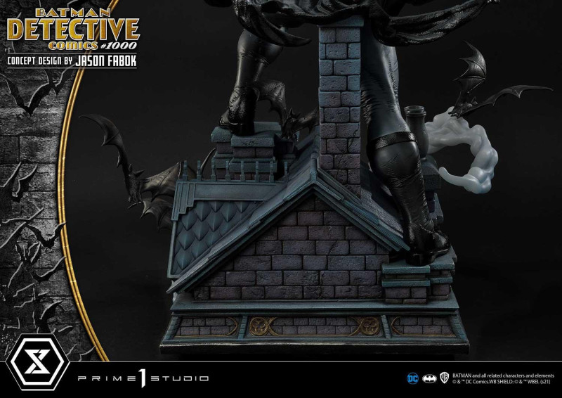 這次根據 Jason Fabok 設計所打造的「蝙蝠俠」雕像高度來到驚人的 104 公分,幾乎是把偵探漫畫第 1000 期的漫畫封面給完全重現,立於建築物頂端的蝙蝠俠,不只再現了蝙蝠戰衣的各處細節與極具立體感的肌肉線條,就連繪畫筆觸也考究地還原,披風複雜且生動的皺摺更帶出強烈的視覺效果,以建築頂部為題的底座也毫不馬虎,精湛塗裝展現真實質感,加上煙霧特效、蝙蝠,相當精美。