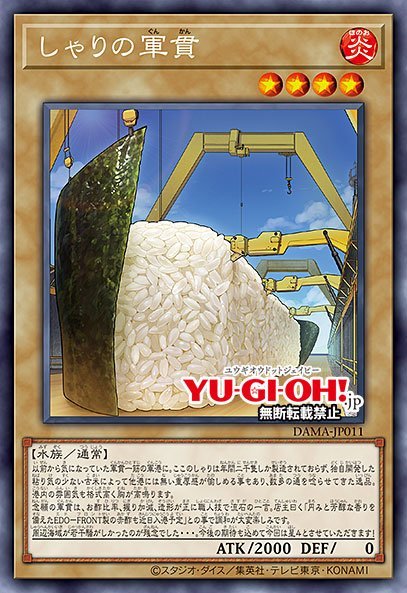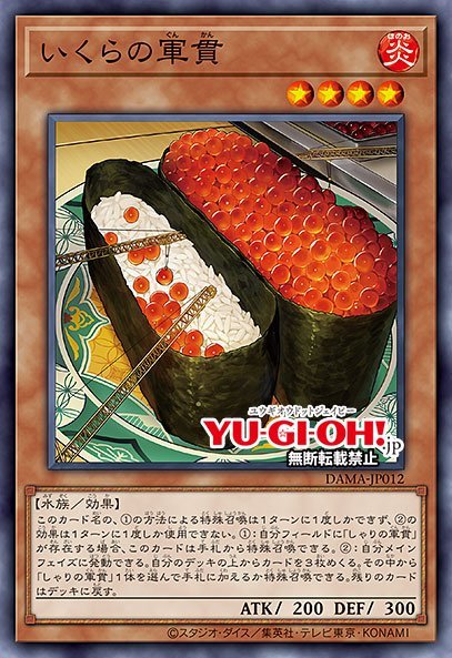 其中最讓玩家感到有趣的,是一副叫做「軍貫(ぐんかん)」的主題牌組,顧名思義就是以壽司為元素的一副牌,你可以在官方所公佈的這些卡面當中,看到各種米飯、海台,以及魚卵特寫的壽司,當然還有軍艦外觀的魚卵壽司。